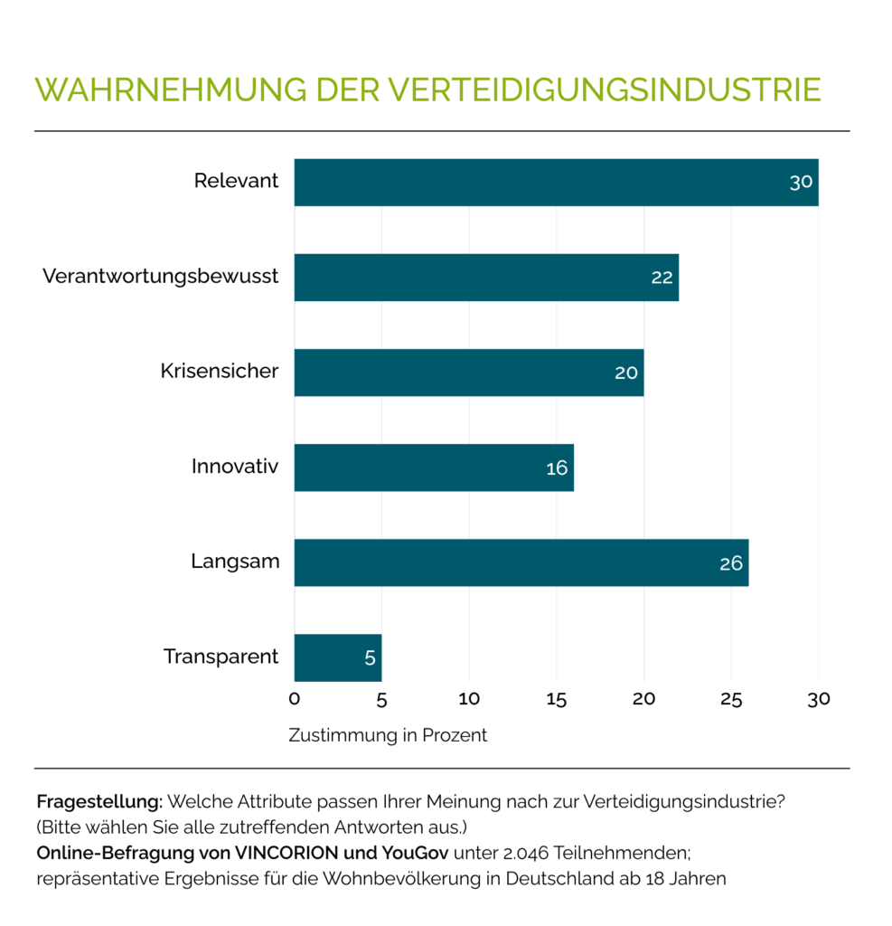 Viele Befragte sehen die Verteidigungsindustrie außerdem als „relevant“ (30 Prozent) und „verantwortungsbewusst“ (22 Prozent) an. Zudem wird sie als „krisensicher“ (20 Prozent) wahrgenommen – in Zeiten wirtschaftlicher Unsicherheit dürfte das ein wichtiger Aspekt sein.