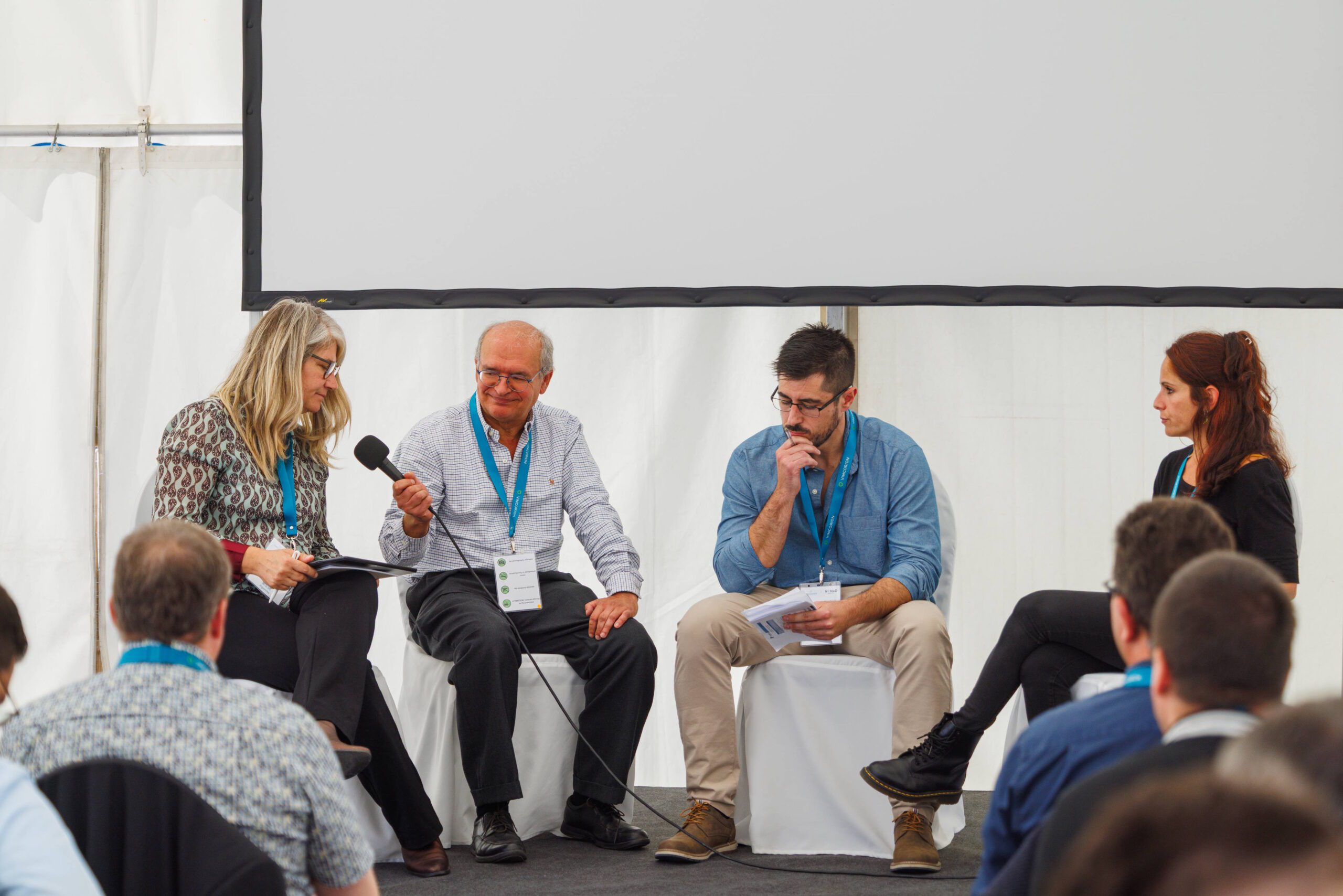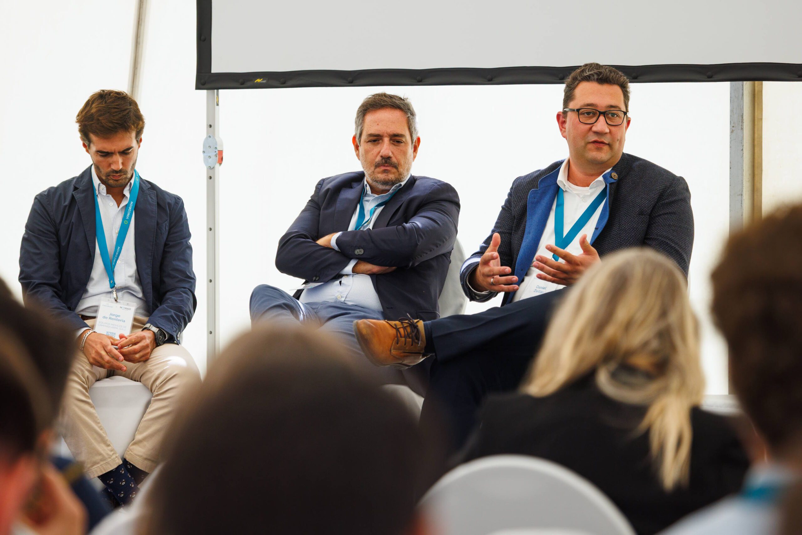 - Auf dem Podium diskutieren Daniel Zeitler, Head of Product VINCORION, mit Theodoros Dionysopoulos, IDE Intracom und Jorge de Renteria von der ARPA (v.r.)